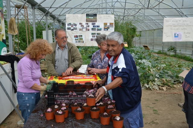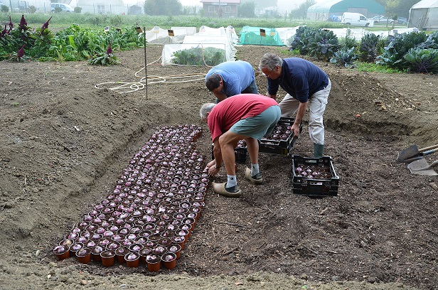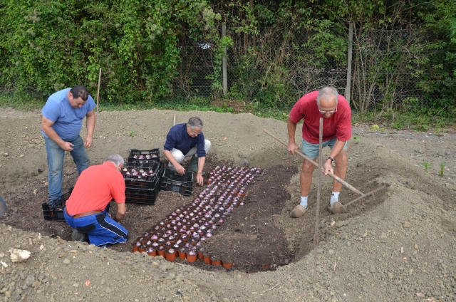 Etape N°1 Les jacinthes sont reçues en septembre, elles sont mises en pot puis enterrées dans le jardin de l’association.
