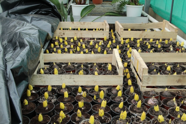 Les jacinthes sont sorties de terre puis entreposées à l’abri de la lumière dans les serres chauffées de la ville de Mantes-La-Jolie pendant environ 15 jours avant la vente.